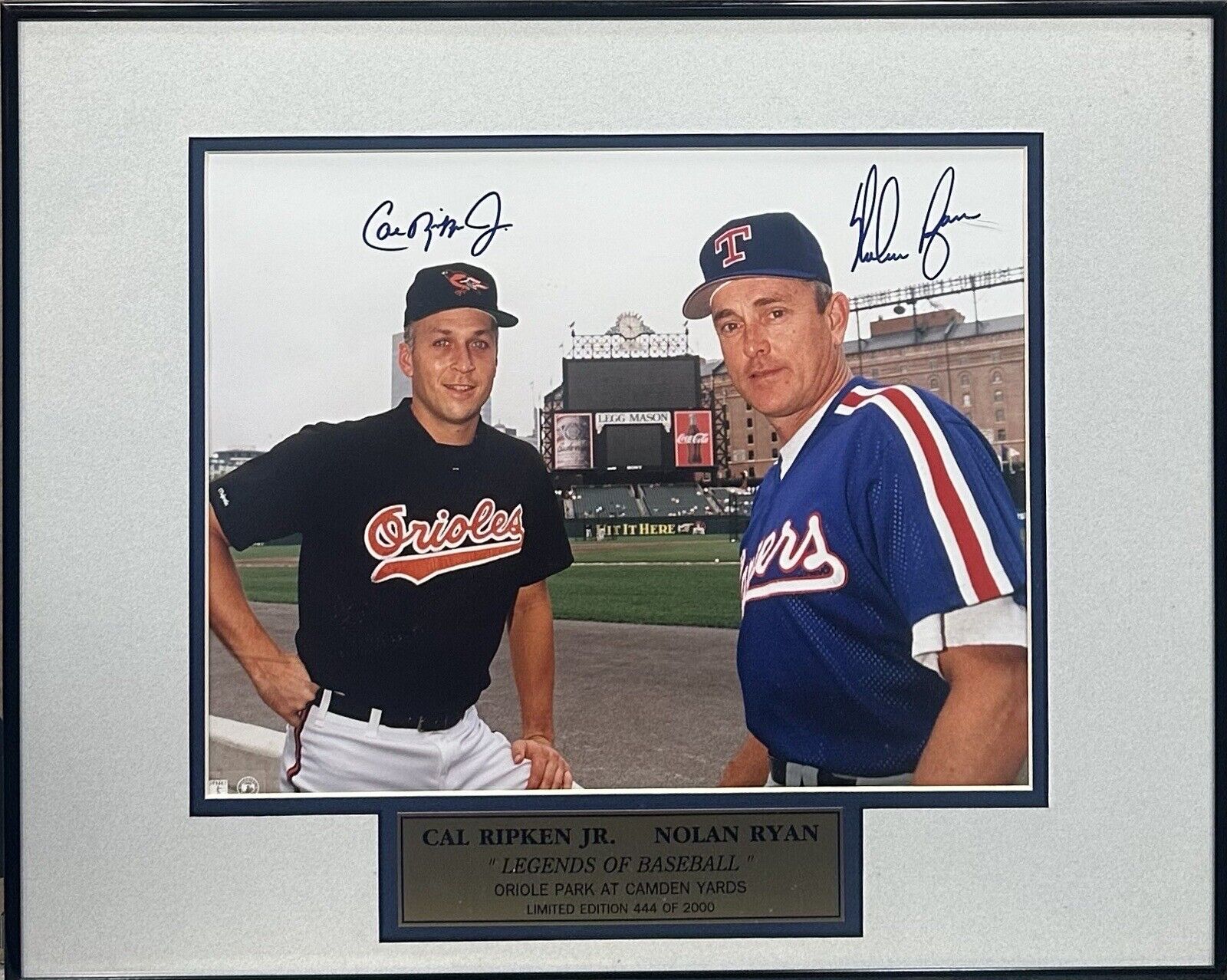 This framed photo is a great addition to any baseball memorabilia collection. To keep it looking its best, display it in a dry place away from direct sunlight. Avoid touching the glass with bare hands to prevent smudges. If needed, gently clean the frame with a soft, dry cloth. Enjoy showing off this amazing piece signed by Cal Ripken Jr and Nolan Ryan.
