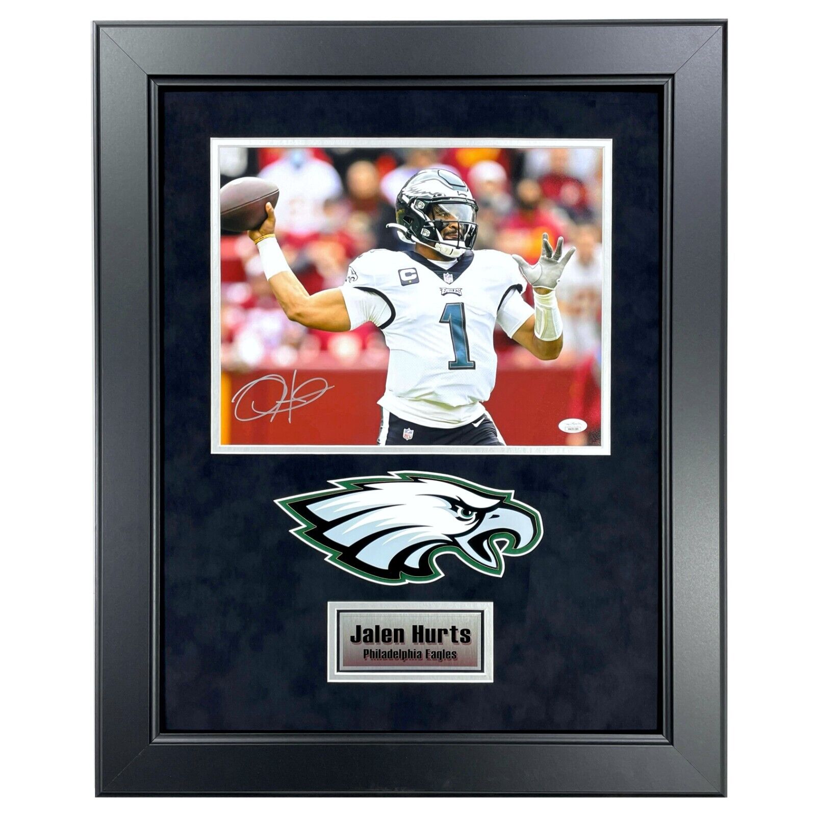 To display this framed Jalen Hurts autographed photo, find a suitable spot on your wall where you can admire it daily. Avoid hanging it in direct sunlight as this could fade the colors over time. Keep it away from areas prone to moisture or humidity. To clean, use a soft, dry cloth to gently wipe the frame. Don’t use harsh chemicals as they might damage the frame or the autograph.