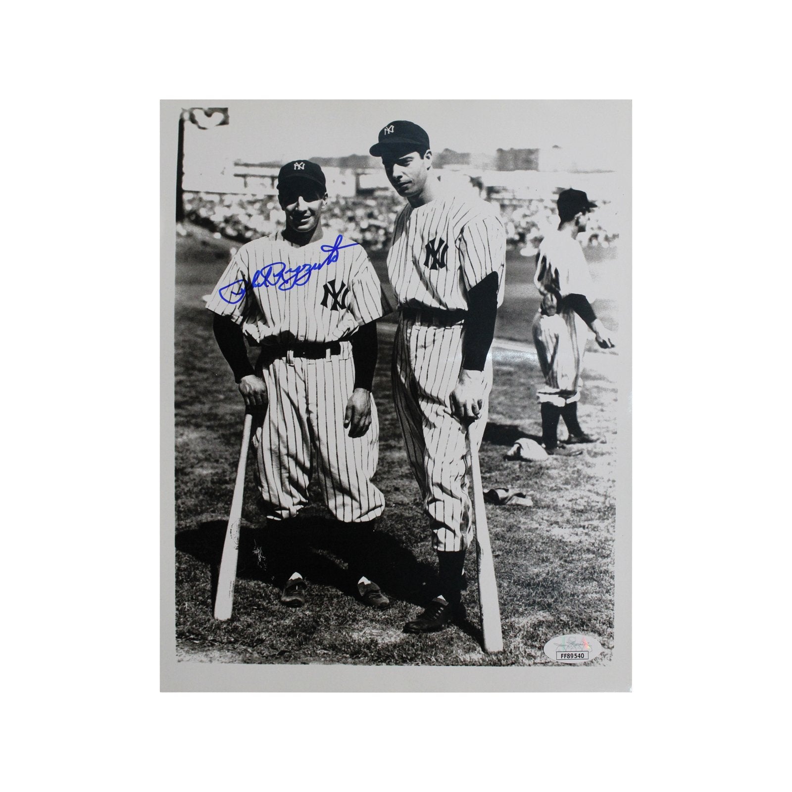 Phil Rizzuto, aka “The Scooter,” was one of the great New York Yankees. Throughout his 13-year Yankee career, Rizzuto was a 5x All-Star, 7x World Series Chion and the 1950 AL MVP. He was inducted into the Baseball Hall of Fame in 1994 and had his #10 retired by the Yankees and honored in Monument Park. This single-Autographed 8×10 photo is of Rizzuto alongside another Yankee great, Joe DiMaggio. It is JSA Authenticated.