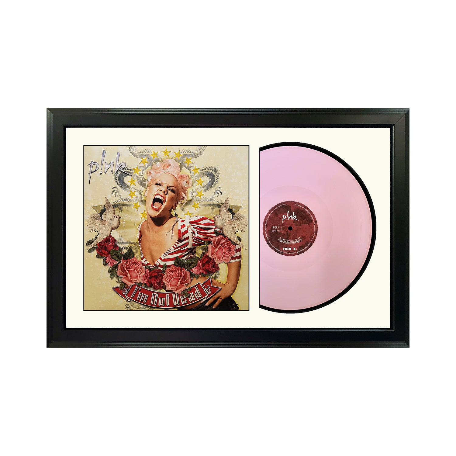 I’m Not Dead is the fourth studio album by American singer and songwriter Pink. It was released on April 4, 2006, through LaFace Records. This genuine album and cover wall display is professionally and beautifully custom framed in 1.5″ black moulding, 17.5″ x 26.5″ frame with real glass. Precision cut mat (note black core accent) floated from background adds depth and visual richness. Frame is finished with paper back dust cover and is ready to hang. Hanging hooks included.